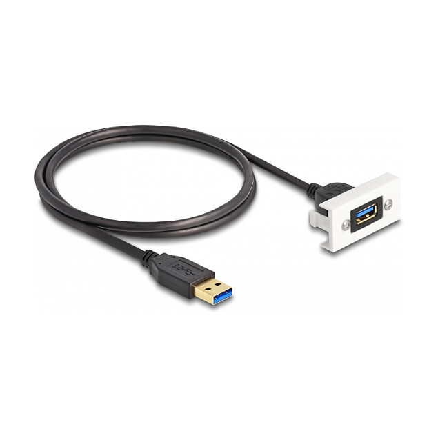 "DeLOCK Easy 45 Module SuperSpeed USB (USB 3.2 Gen 1) USB Type-A female to USB Type-A male with pigtail, 22,5 x 45 mm. Cable length: 1 m. Connector 1: USB A, Connector 2: USB A, USB version: USB 3.2 Gen 1 (3.1 Gen 1), Maximum data transfer rate: 5 Gbit/s, Product colour: Black"\n"This Easy 45 module by Delock is designed to provide a USB Type-A female port. The simple snap-in mechanism ensures that the cover is firmly in place and can be easily and toolless changed if necessary.
