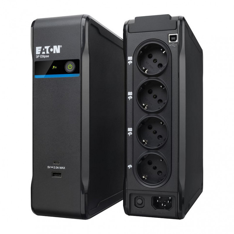 "Eaton 3P Ellipse. UPS topology: Standby (Offline), Output power capacity: 0.9 kVA, Output power: 540 W. AC outlet types: C14 coupler, AC outlets quantity: 4 AC outlet(s), USB port type: USB Type A/USB Type-C. Battery capacity: 9 Ah, Battery voltage: 12 V. Form factor: Tower, Product colour: Black, Display type: LED. Compliance certificates: CB, CE, RoHS, WEEE, Certification: IEC/EN 62040-1 IEC/EN 62040-2 IEC/EN 62040-3 CE UKCA Ukr Cm"\n"The 3P Ellipse UPS is Eaton’s latest addition to its power protection solution portfolio. Sleek, attractively designed, and silent in operation, this compact UPS offers an exceptional user experience for backup power in both residential and small business settings.