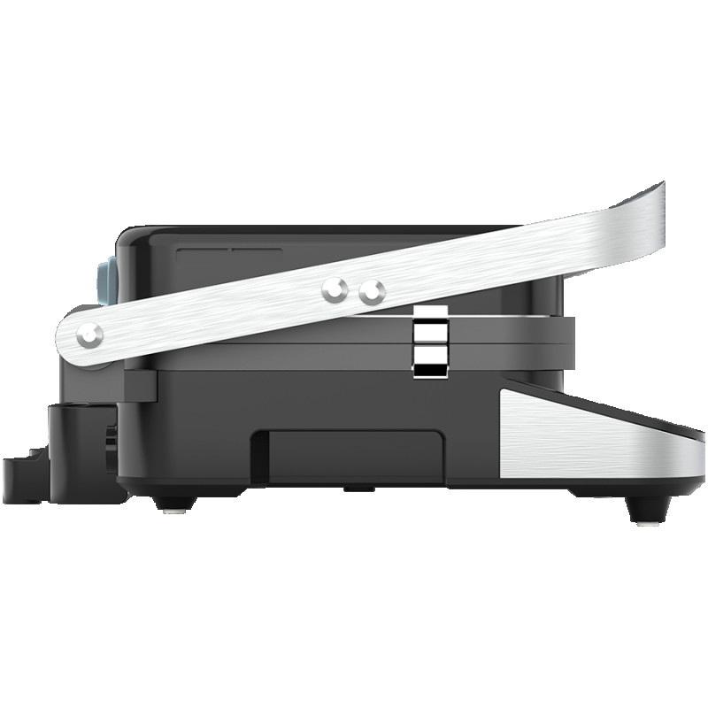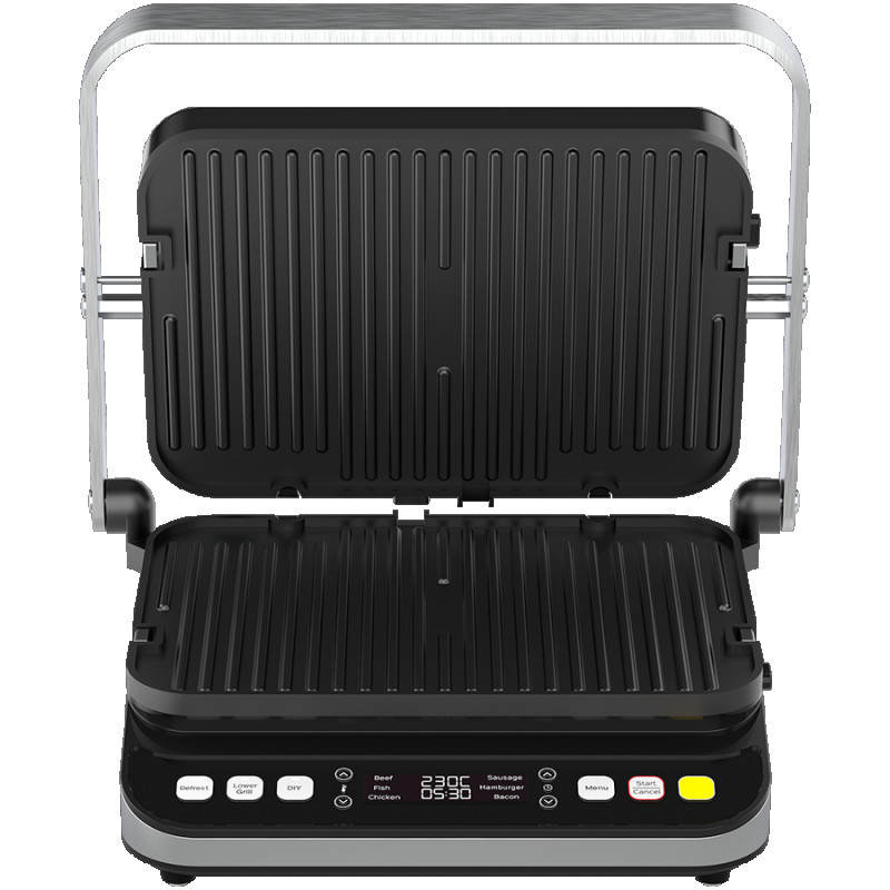 Defrost Function e-Recipe Book 3-in-1: Grill, Barbecue and Oven Powerfull - 2000W Precise Manual settings: up to 230 °C in 5 °C increments; up to 60 minutes timer Enlarged coking space: 6 portions at the same time Cook at 2 plates at the same time: 180° opening angle Double-sided plates: choose the preferable ones - ribbed or flat Convinient LED display Intuitive touch control Auto power-off: overheat protection Cook healthy food with no oil: non-stick plates 5 minutes for ideal medium-rare steak Anti-slip feet keeps grill firmly in place Color and sound indication Oil Drip tray: less mess while cooking Removable non-stick plates: easy-to-clean under the tap or in dishwasher Fast pre-heating: ready to use in 2 minutes Safe-to-touch: non-heated handle and top surface Included: 2 double sided plates, oil drip tray Compatible accessories always available: waffle plates, double-sided plates 320*220mm plate size 6 preset cooking programs: Beef, Fish, Chicken, Sausage, Hamburger, Bacon 2 cooking modes: lower grill or both grills Easy-to-clean control panel |
