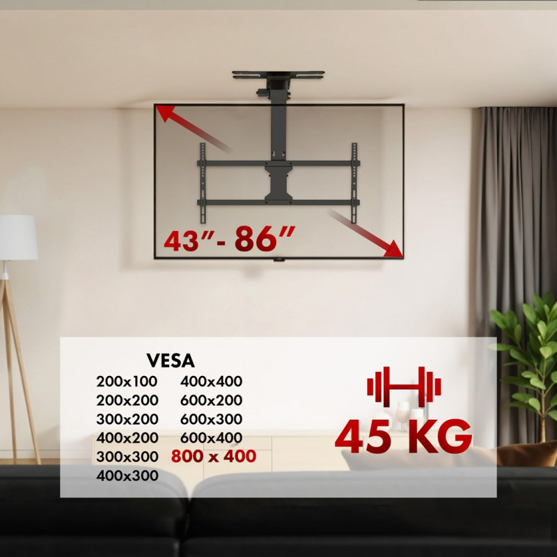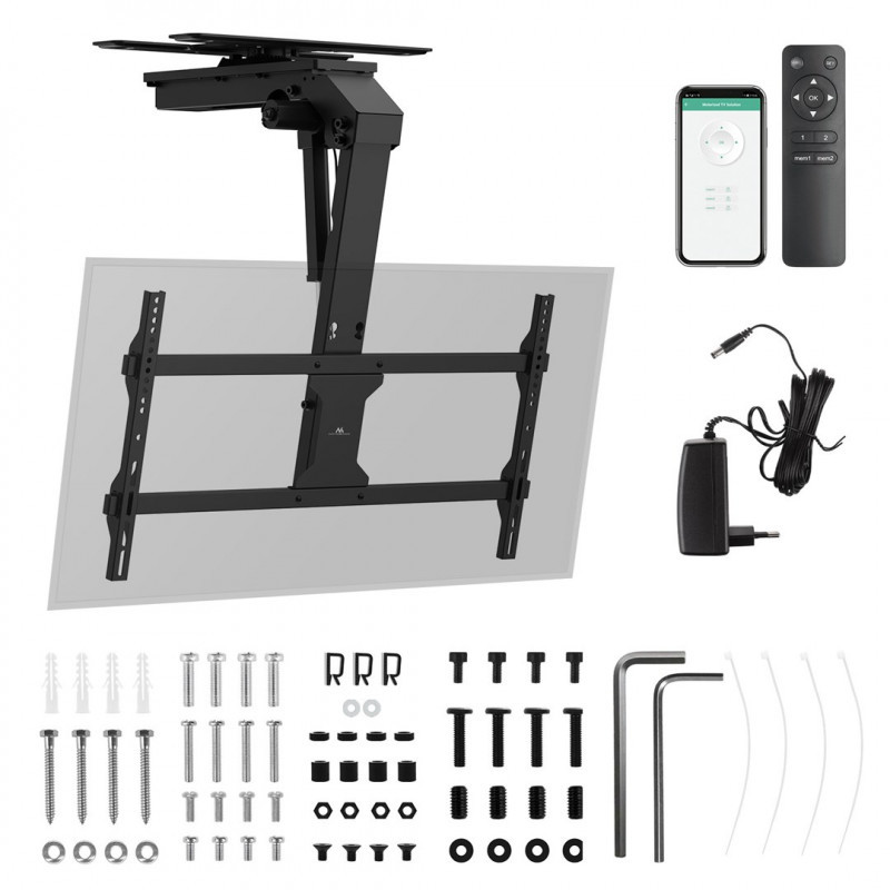 Elektrinis TV laikiklis Maclean, montuojamas prie lubų, valdomas Tuya, maks. VESA 800x400, reguliuojamas +90°~-90° padėtyje, skirtas 43-86 colių televizoriams, maks. 45 kg, MC-109 T