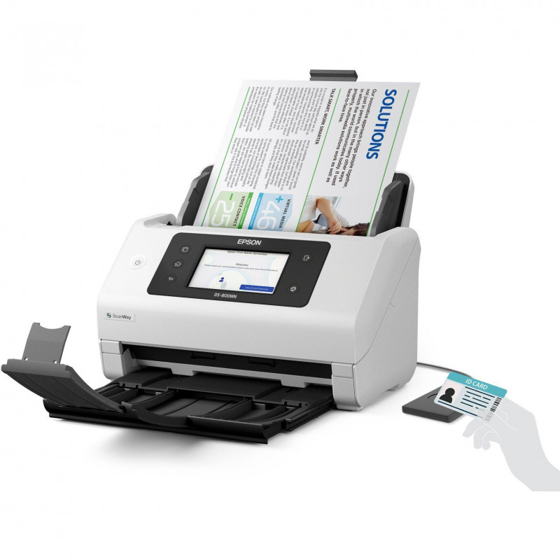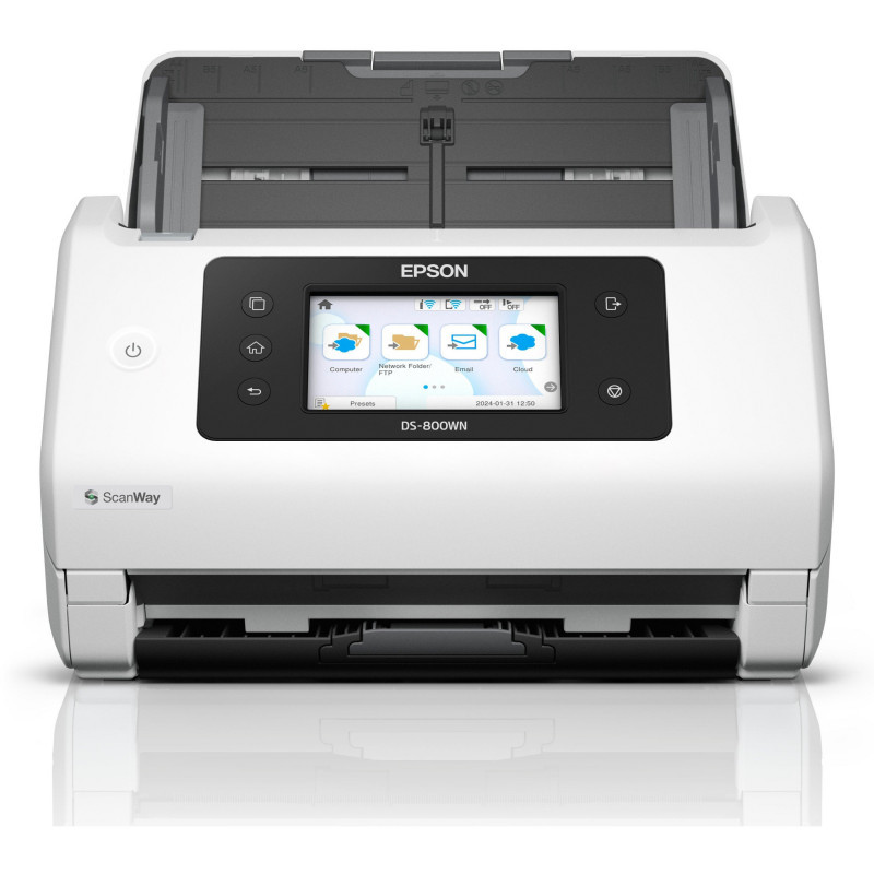 "Epson WorkForce DS-800WN. Maximum scan size: 215.9 x 6096 mm, Optical scanning resolution: 600 x 600 DPI, Input colour depth: 30 bit. Scanner type: Sheet-fed scanner, Product colour: White, Display: LCD. Daily duty cycle (max): 8000 pages, Scan file formats: BMP, JPEG, PDF, PNG, TIFF, Scan to: Cloud, E-mail, Network folder, PC, USB. Standard input capacity: 100 sheets, Auto document feeder (ADF) input capacity: 100 sheets. Maximum ISO A-series paper size: A4, Scanning media types supported: Business Card, Envelopes, Plastic Card, ISO A-series sizes (A0...A9): A3, A4, A5, A6"\n"Open platform