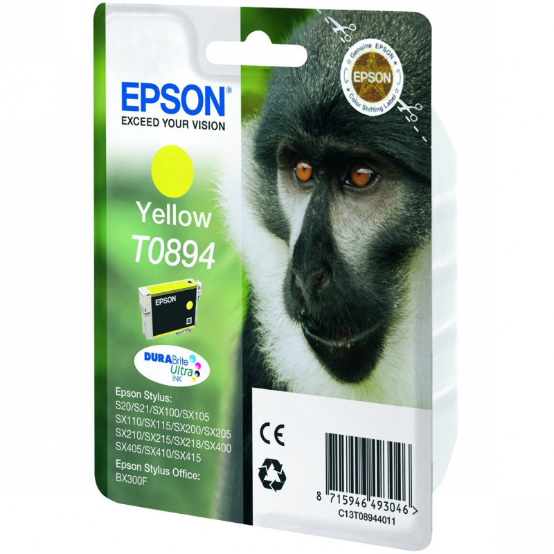 "Epson Monkey Singlepack Yellow T0894 DURABrite Ultra Ink. Colour ink type: Pigment-based ink, Colour ink volume: 3.5 ml, Printing colours: Yellow, Quantity per pack: 1 pc(s)"\n