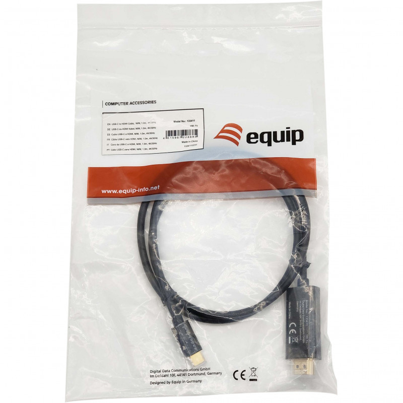 "Equip USB-C to HDMI Cable, M/M, 1.0m, 4K/30Hz. Cable length: 1 m, Connector 1: USB Type-C, Connector 2: HDMI Type A (Standard). Compliance certificates: CE, RoHS. Weight: 50 g. Package width: 275 mm, Package height: 175 mm, Package weight: 54 g. Quantity per pack: 1 pc(s)"\n"The Equip® USB-C to HDMI adapter cable offers a convenient solution for directly connecting your USB-C™ device to your HDMI monitor or projector, Quality and stable transmission, gold-plated joints do not rust, say goodbye to water ripple stable transmission.