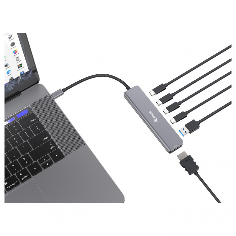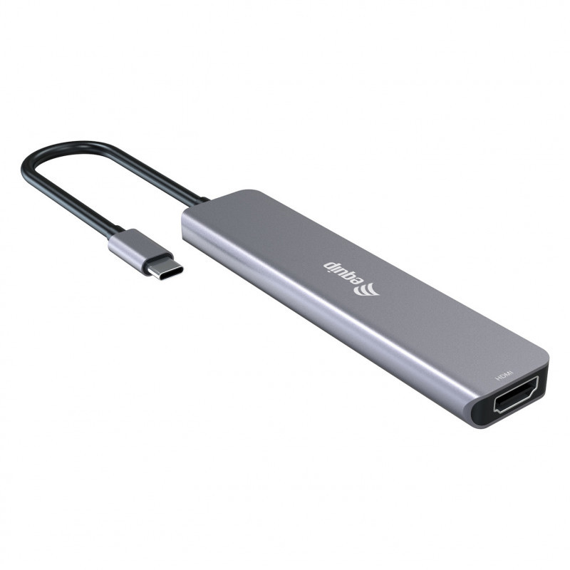 "Equip USB-C 6 in 1 Multifunctional Adapter, HDMI 4K/30Hz, USB-C x 4 , USB-A x 1, 5Gbps, 100W USB PD. Connectivity technology: Wired, Host interface: USB 3.2 Gen 1 (3.1 Gen 1) Type-C, USB Power Delivery up to: 100 W. Product colour: Grey, HD type: 4K Ultra HD, Maximum digital resolution: 3840 x 2160 pixels. Power source type: USB, USB cable length: 0.25 m. Width: 113.3 mm, Depth: 28 mm, Height: 10 mm. Package width: 173 mm, Package depth: 23 mm, Package height: 75 mm"\n"The Equip 133500 USB-C 6-in-1 Multifunctional Adapter is a compact and versatile accessory designed to maximize the connectivity of modern laptops, tablets, and smartphones equipped with USB-C ports. Built with portability and convenience in mind, this adapter integrates six essential functions into one sleek device, eliminating the need to carry multiple dongles.