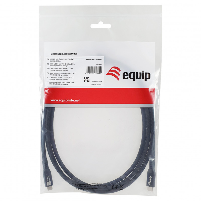 "Equip USB 4 C to C Cable, 2m, PD240W, 8K/60Hz, 80Gbps, Black. Cable length: 2 m. Connector 1: USB C, Connector 2: USB C, USB version: USB4 Gen 4x2, Maximum data transfer rate: 80 Gbit/s, Product colour: Black"\n"The 128442 USB4 C to C cable is engineered for ultra-high-speed data transfer, advanced display output, and high-power charging through a single USB-C connection.