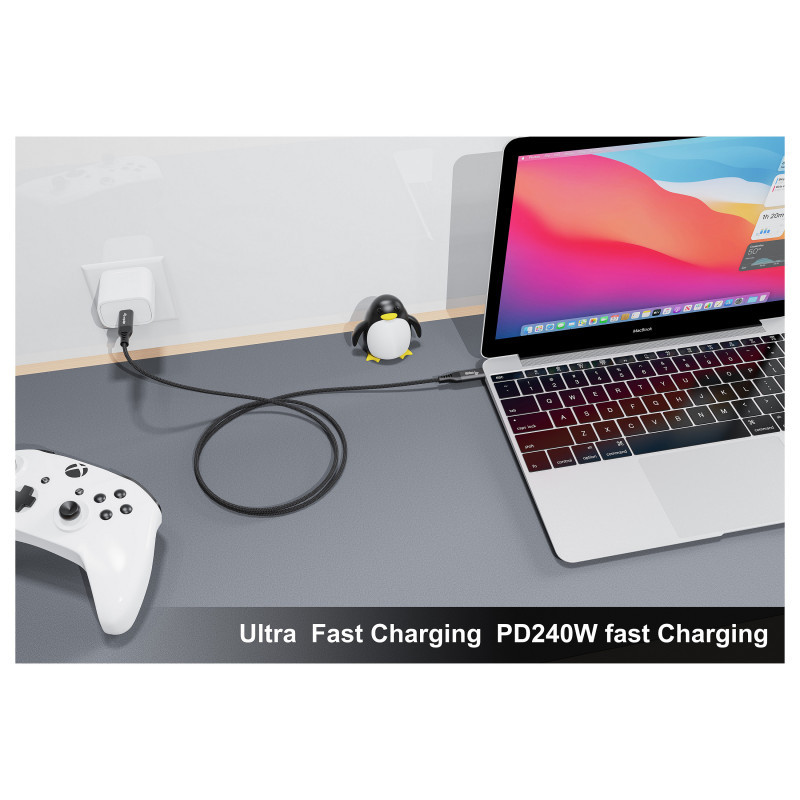 Equipped with an integrated E-marker chipset and Power Delivery 3.1 support, the cable delivers up to 240W (48V/5A), making it suitable for power-hungry laptops and professional workstations. Premium braided cotton mesh, double shielding, and an aluminum housing ensure stable performance, signal integrity, and long-term durability."