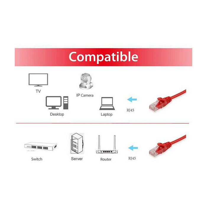 "Equip Cat.6 U/UTP Patch Cable, 0.15m, Red. Cable length: 0.15 m, Cable standard: Cat6, Cable shielding: U/UTP (UTP), Connector 1: RJ-45, Connector 2: RJ-45, Data transfer rate: 1000 Mbit/s, Product colour: Red"\n"The equip® Cat.6 U/UTP Patch Cable is composed of preeminent materials and fully-examined to conform with industrial standards. Offering higher bandwidth and better signal-to-noise margin, the Cat.6 cable is able to deliver ultrahigh and error-free performance in the most demanding network environments."