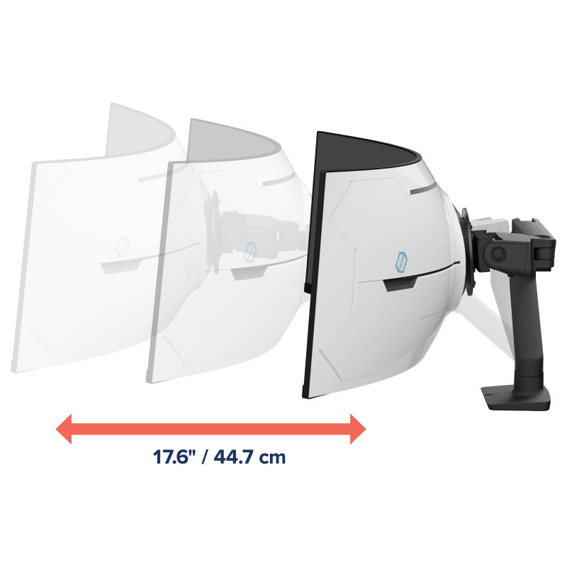"Ergotron HX Series HX ARM WITH VERY HEAVY DUTY PIVOT DESK. Mounting: Clamp, Maximum weight capacity: 17 kg, Maximum screen size: 144.8 cm (57""), Minimum VESA mount: 75 x 75 mm, Maximum VESA mount: 100 x 100 mm. Height adjustment, Tilt angle range: 5 - 20°. Product colour: Black"\n"Enable immersive viewing experiences and take back your desk space. Our best-selling HX Monitor Arm is now available with a very heavy-duty tilt pivot, giving gamers and office professionals the freedom to move and position ultra-wide curved displays 9.1""–13.8” (23–35 cm) deep and 28.7–37.5 lbs (13–17 kg), like the Samsung® 57″ Odyssey G9 Gaming Monitor.