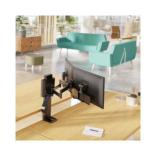"Ergotron TRACE 45-631-224. Mounting: Clamp, Maximum weight capacity: 9.8 kg, Maximum screen size: 68.6 cm (27""), Minimum VESA mount: 75 x 75 mm, Maximum VESA mount: 100 x 100 mm. Height adjustment. Product colour: Black"\n"The innovative TRACE Dual Monitor Mount adapts to how each user works and feels their best to create ergonomic, flexible workspaces. It intuitively adjusts between tasks and postures to encourage movement and collaboration, always returning to the natural home position. The modular TRACE design and premium, 15-year warranty solidify a long-term investment.