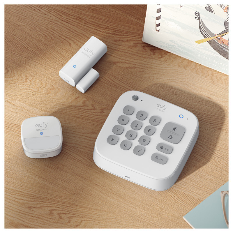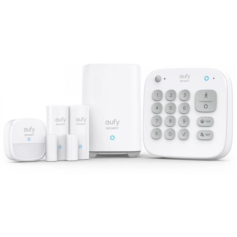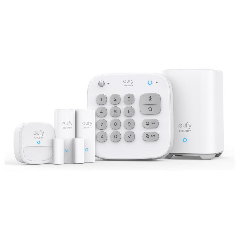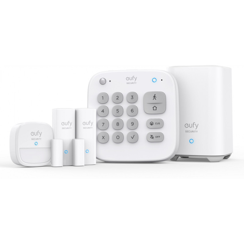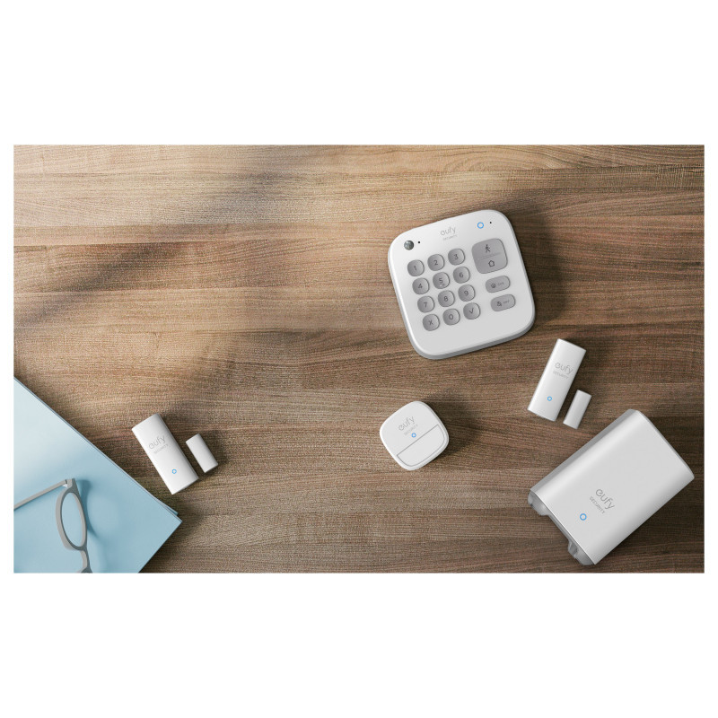 "Eufy 5-Piece Smart Security Home Alarm Kit. Product colour: White, Alert notification type: GSM, SMS. Central control unit interface: RF Wireless, Central control unit connectivity technology: Wi-Fi, Wi-Fi standards: 802.11b, 802.11g, Wi-Fi 4 (802.11n). Door/window sensor interface: RF Wireless, Door/window sensor connectivity technology: Wi-Fi, Door/window sensor operating temperature (T-T): -10 - 50 °C. Siren connectivity technology: Wi-Fi, Siren operating temperature (T-T): -10 - 50 °C, Siren dimensions (WxDxH): 56.2 x 22 x 56.2 mm. Package type: Box"\n"Install your eufy 5-piece smart home alarm kit in just a few minutes. When motion or a breach is detected, you'll receive notifications straight to your smartphone via the eufy app.