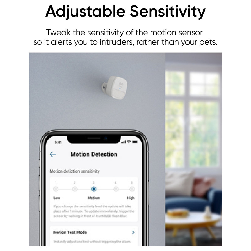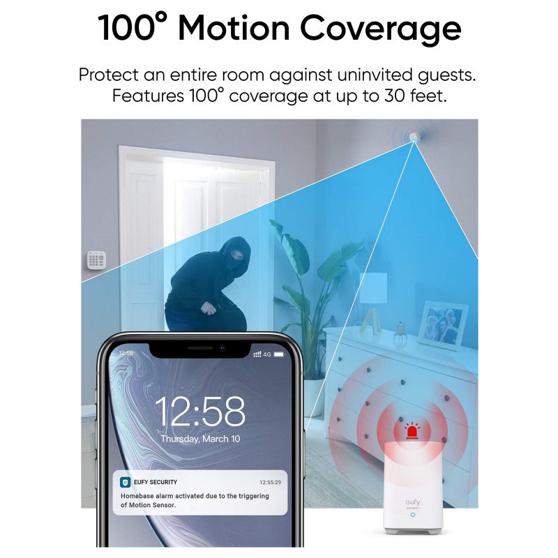 Easily program, arm, and disarm your security system in the eufy app or by PIN on the keypad. The motion sensor has 100° coverage at up to 9 metres and the sensitivity of its motion detection is adjustable, making it ideal for pet owners.