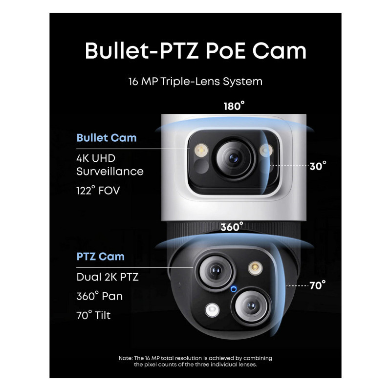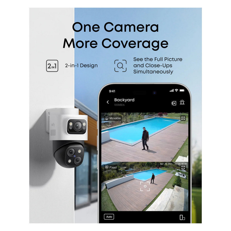 - Auto-Framing and Group Tracking: When the bullet camera detects a subject, the PTZ locks on and auto-tracks them in sharp, centered close-ups from up to 164 ft away. Auto-zoom keeps moving subjects framed until they exit view.