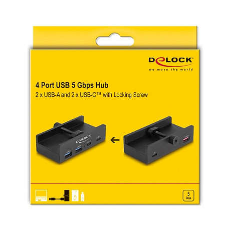 Due to the included USB cable and the locking screw, this Delock hub is particularly suitable for easy mounting on a monitor or desk. This means that the hub is always at the same location. In addition, the USB devices can be plugged in with one hand, the hub does not have to be held additionally.