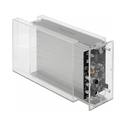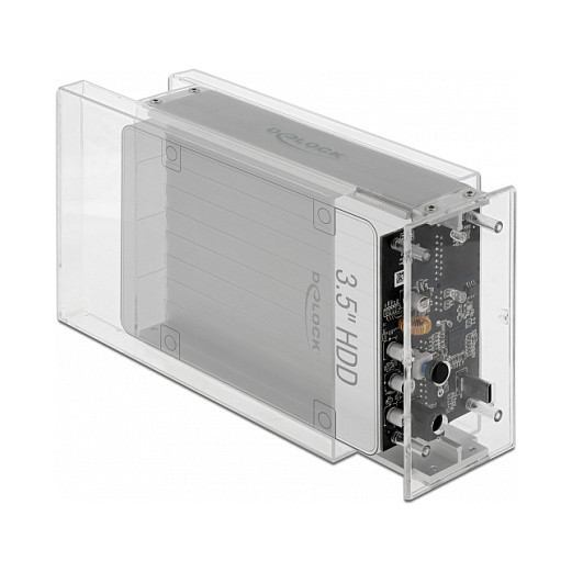 "DeLOCK External Dual Enclosure for 2 x 3.5″ SATA HDD with USB Type-C female transparent - tool free. Product type: HDD/SSD enclosure. Number of storage drives supported: 2, Storage drive size: 2.5/3.5"", Supported storage drive interfaces: Serial ATA, Hot-swap. Product colour: Transparent. USB connector type: USB Type-C"\n"This plastic enclosure by Delock is used for the installation of two 3.5″ SATA hard drive. The included USB Type-C™ to USB Type-A cable allows the connection to a free USB Type-A female port.