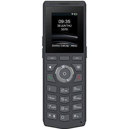 "Fanvil W610W. Product type: IP mobile phone, Product colour: Black, Handset type: Wireless handset. Lines quantity: 4 lines, Phonebook capacity: 1000 entries. Display diagonal: 5.08 cm (2""), Display resolution: 240 x 320 pixels. Voice codecs: G.711a, G.711u, G.723.1, G.726, G.729ab. Wi-Fi standards: Wi-Fi 5 (802.11ac), Security algorithms: EAP, WPA, WPA2"\n