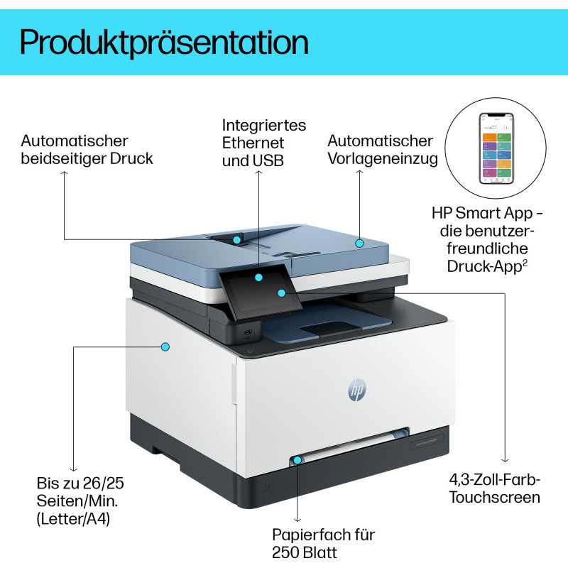 "HP Color LaserJet Pro MFP 3302fdn, Color, Printer for Small medium business, Print, copy, scan, fax, Print from phone or tablet; Automatic document feeder; Two-sided printing; Scan to email; Scan to PDF; Fax; Front USB flash drive port; Touchscreen; TerraJet cartridge. Print technology: Laser, Printing: Colour printing, Maximum resolution: 600 x 600 DPI, Print speed (colour, normal quality, A4/US Letter): 25 ppm. Copying: Colour copying, Maximum copy resolution: 600 x 600 DPI. Scanning: Colour scanning, Optical scanning resolution: 1200 x 1200 DPI. Faxing: Mono faxing. Duplex functions: Print, Copy. Maximum ISO A-series paper size: A4. Direct printing. Product colour: Grey, White"\n"Reliable, high-quality color printing, scanning, copying, and faxing. Designed for business work teams that need professional performance with fast, high-quality color printing, scanning, copying and faxing, laser productivity, and award-winning reliability[11] in a space-saving design.