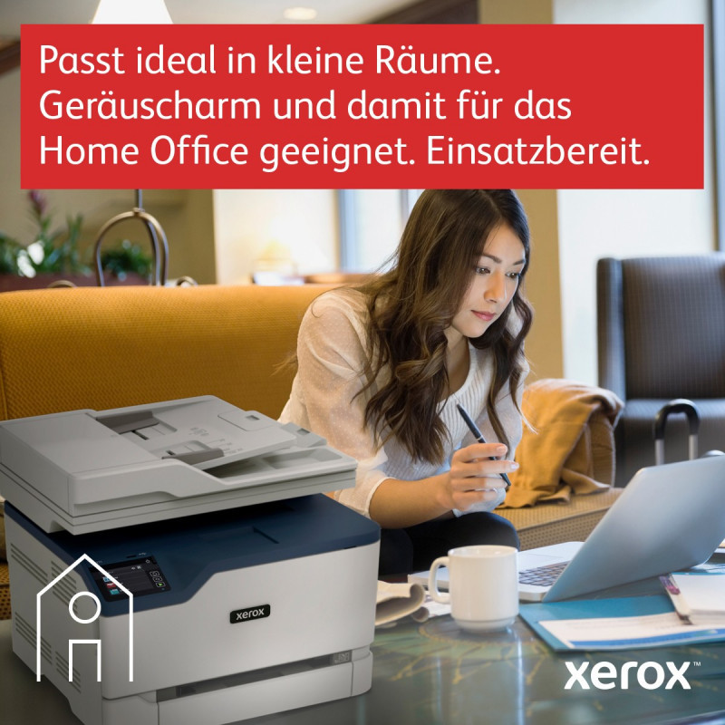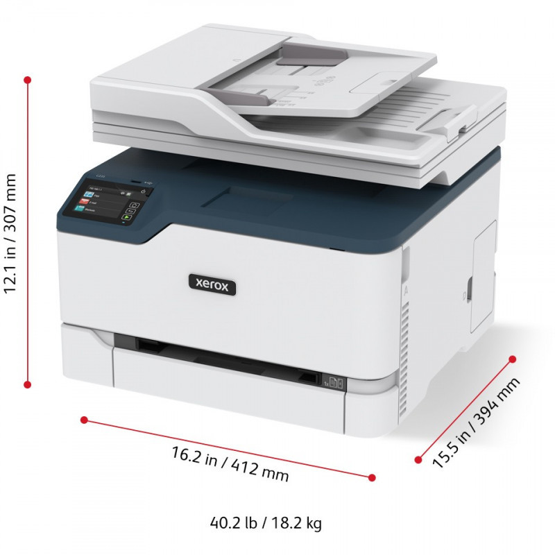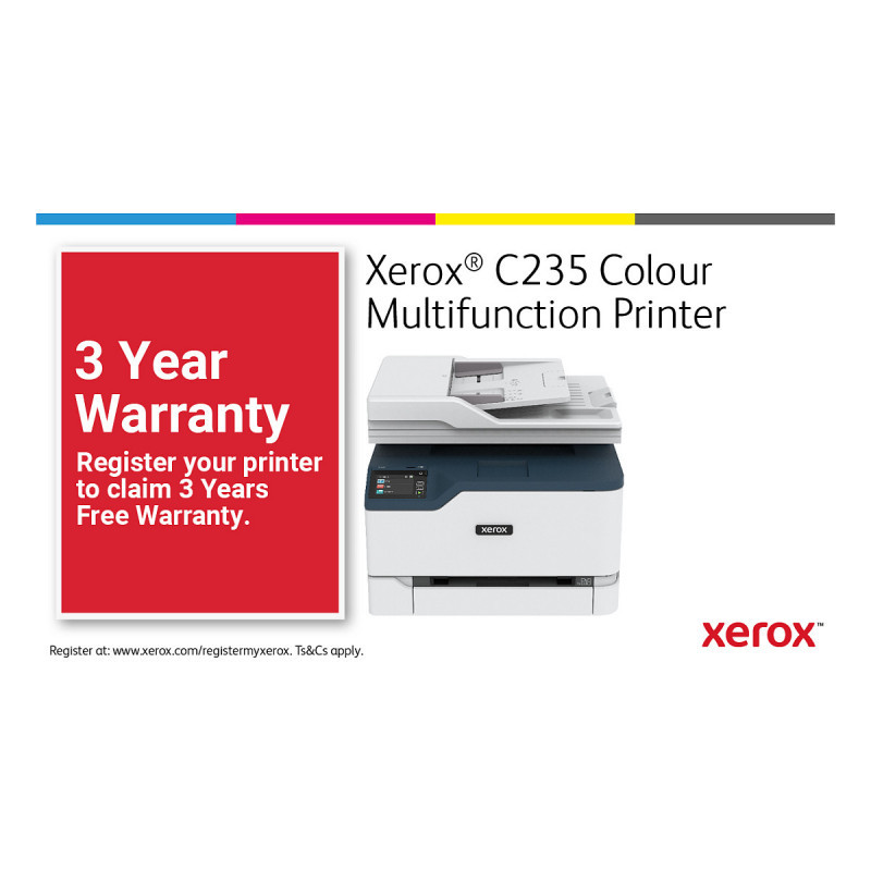 "Xerox C235 A4 22ppm Wireless Copy/Print/Scan/Fax PS3 PCL5e/6 ADF 2 Trays Total 251 Sheets. Print technology: Laser, Printing: Colour printing, Maximum resolution: 600 x 600 DPI, Print speed (colour, normal quality, A4/US Letter): 22 ppm. Copying: Colour copying, Maximum copy resolution: 600 x 600 DPI. Scanning: Colour scanning, Optical scanning resolution: 600 x 600 DPI. Faxing: Mono faxing. Duplex functions: Copy, Fax, Print. Maximum ISO A-series paper size: A4. Wi-Fi. Direct printing. Product colour: Blue, White"\n"The affordable Xerox C235 Color Multifunction Printer is built for fast,nimble offices and home offices that need a color printer that can keep up with them. Easy to set up with Xerox® Smart Start Software and ready to work hard right out of the box. This device was designed for high-demand print environments, with 2.4-inch color touchscreen user interface, 50-sheet automatic document feeder, automatic 2-Sided printing on letter and legal size paper with standard paper capacity of 250 sheets. Built-in wireless and Wi-Fi Direct functioN/Ality lets you print directly from mobile devices and tablets. Designed with a recommended monthly print volume of up to 1,500 pages per month, a 1 GHz dual core processor, 512 MB memory, and print speeds up to 24 Letter pages per minute/ 22 A4 pages per minute the C235 is a workhorse. Do more with optioN/Al Xerox Workflow Central, allowing you to convert documents into other languages, change handwriten messages into shareable text documents, create audio files of hardcopy to listen to on the go, automatically redact content, and convert scans into Microsoft Office Applications. Achieving EPEAT certification means the C235 meets comprehensive criteria for design, production, energy use, and recycling. And our Green World Alliance program offers hassle-free toner cartridge recycling."