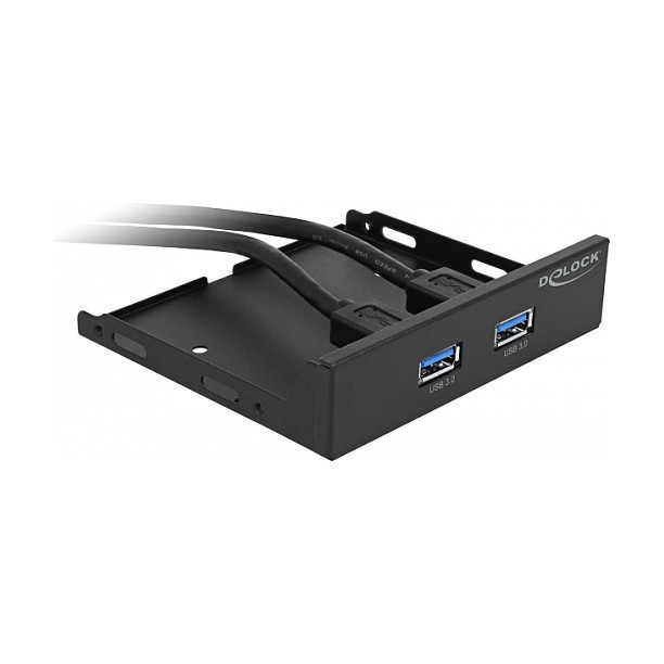 "DeLOCK 63994. Product colour: Black"\n"This front panel by Delock can be installed into a free 3.5″ bay of a computer. It has two USB 3.0 ports and will be connected internally via a USB 3.0 pin header male on the motherboard."
