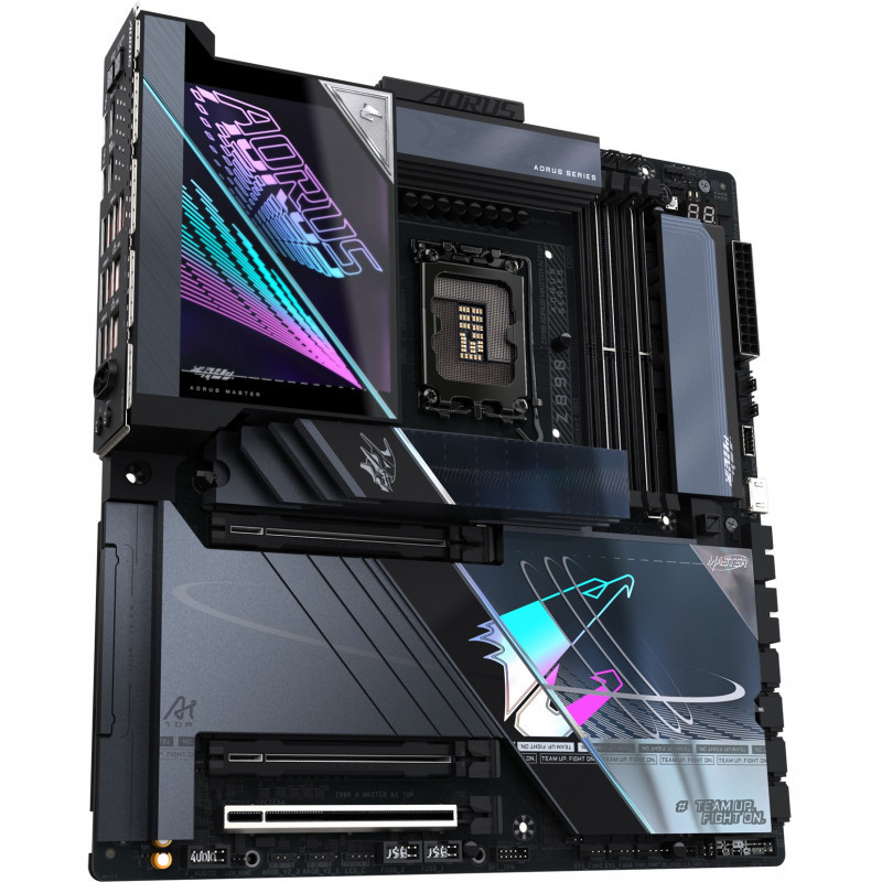 "GIGABYTE Z890 AORUS MASTER AI TOP Motherboard - Supports Intel Core Ultra (Series 2) CPUs, 20+1+2 phases VRM, up to 9500MHz DDR5 (OC), PCIe 5.0 M.2, Wi-Fi 7, Thunderbolt 4. Processor manufacturer: Intel, Processor socket: LGA 1851 (Socket V1), Compatible processor series: Intel Core Ultra (Series 2). Supported memory types: DDR5-SDRAM, Maximum internal memory: 256 GB, Memory slots type: DIMM. Supported storage drive interfaces: M.2, SATA III, Supported storage drive types: HDD & SSD, RAID levels: 0, 1, 5, 10. Maximum resolution: 5120 x 2880 pixels. Ethernet interface type: 10 Gigabit Ethernet, LAN controller: Marvell AQtion AQC113C, Top Wi-Fi standard: Wi-Fi 7 (802.11be)"\n"Elevate your computing experience with GIGABYTE's renowned motherboard series: AORUS, AERO, and GIGABYTE. Featuring innovative designs and advanced features, these boards offer exceptional performance and reliability. Whether you're a gamer, content creator, or professional, our series cater to your needs, ensuring uncompromising quality and cutting-edge"