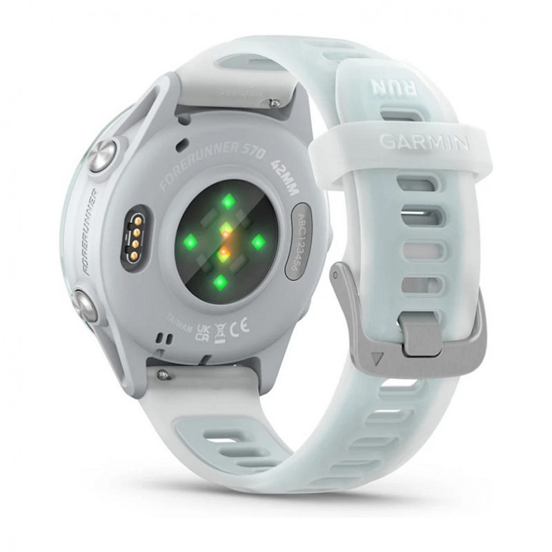 "Garmin Forerunner 570. Display diagonal: 3.05 cm (1.2""), Display technology: AMOLED, Display resolution: 390 x 390 pixels, Touchscreen. Flash memory: 8 GB. Wi-Fi. GPS (satellite). Weight: 42 g. Band material: Silicone, Band colour: White"\n"GARMIN COACH ADAPTIVE TRAINING PLANS