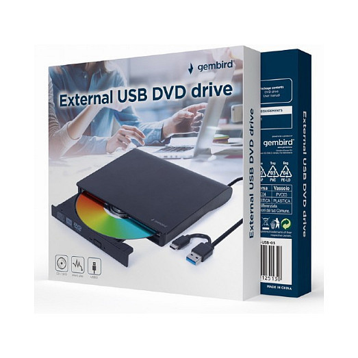 "Gembird DVD-USB-031. Product colour: Black, Disc loading type: Front, Certification: CE. Purpose: Desktop, Optical drive type: DVD±RW, Interface: USB Type-C. DVD+R write speed: 8x, CD-R write speed: 24x, DVD-R write speed: 8x. CD-ROM read speed: 24x, DVD-ROM read speed: 8x. Width: 140 mm, Depth: 140 mm, Height: 18 mm"\n"External CD/DVD reader/recorder with USB interface