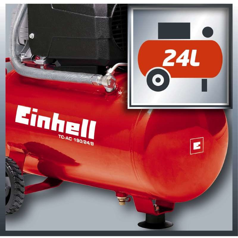 "Einhell TC-AC 190/24/8. Intake capacity: 165 l/min, Pump motor speed: 2850 RPM, Maximum operating pressure: 8 bar. Product colour: Black, Red, Suitable for: Car. Motor power: 1500 W, Power source: AC, AC input voltage: 220-240 V. Weight: 20.8 kg, Package width: 258 mm, Package depth: 578 mm"\n"The TC-AC 190/24/8 is a versatile compressor, which is doing a good job at a lot of works with compressed air due to its compact measures and 8 bar working pressure. The regulated working pressure can be set precisely with the pressure reducer, and is displayed on the pressure gauge. Via quick connect, various compressed-air tools can be operated quickly and without tools. The 24 litre tank has therefore sufficient air reserves. The oil lubrication pump saves the durability of the compressor. The operator´s safety is optimally provided due to a non-return valve and a safety valve. The condensatation can be drained off the vessel comfortably and properly per drip cock. The vibration-absorbing foot avoids vibrations and reduces noise. The transport handle and two rubber wheels care for quick mobility and easy transport. There is a 10 years warranty against rusting through of the tank."