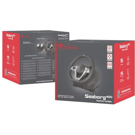 "GENESIS Seaborg 400. Device type: Steering wheel + Pedals, Gaming platforms supported: Nintendo Switch, PC, PlayStation 4, Playstation 3, Xbox 360, Xbox One, Xbox One S, Xbox One X, Gaming control function buttons: D-pad. Connectivity technology: Wired, Device interface: USB, USB connector type: USB Type-A. Product colour: Black, Silver, Cable length: 2 m. Power source: Cable. Windows operating systems supported: Windows 10, Windows 7, Windows 8, Windows Vista, Windows XP"\n"BE THE FIRST ON THE FINISH LINE WITH SEABORG 400