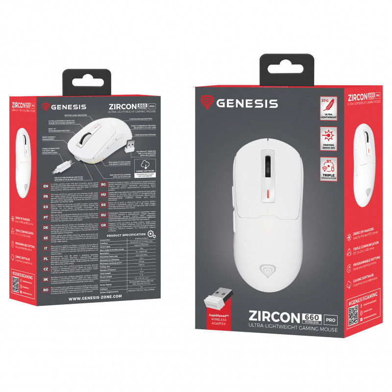 "GENESIS NMG-2194. Form factor: Ambidextrous. Movement detection technology: Optical, Device interface: Bluetooth + USB Type-C, Movement resolution: 26000 DPI, Buttons quantity: 6, Scroll type: Ring, Acceleration (max): 50 G. Power source: Batteries/Cable. Product colour: White"\n"Triple communication mode, one of the best optical sensors and an even lighter weight of just 57 grams, and that's not all. Here is the GENESIS Zircon 660 Pro, which offers even more. Whether you're a novice gamer or an advanced e-sports gaming fan, the GENESIS Zircon 660 Pro offers reliability, comfort and top-of-the-line features to give you a real edge.