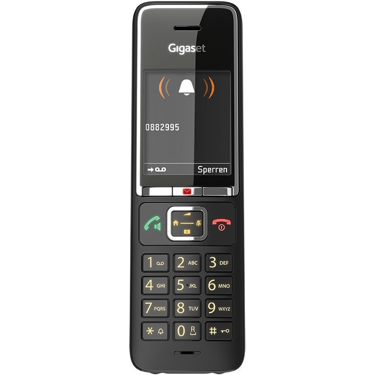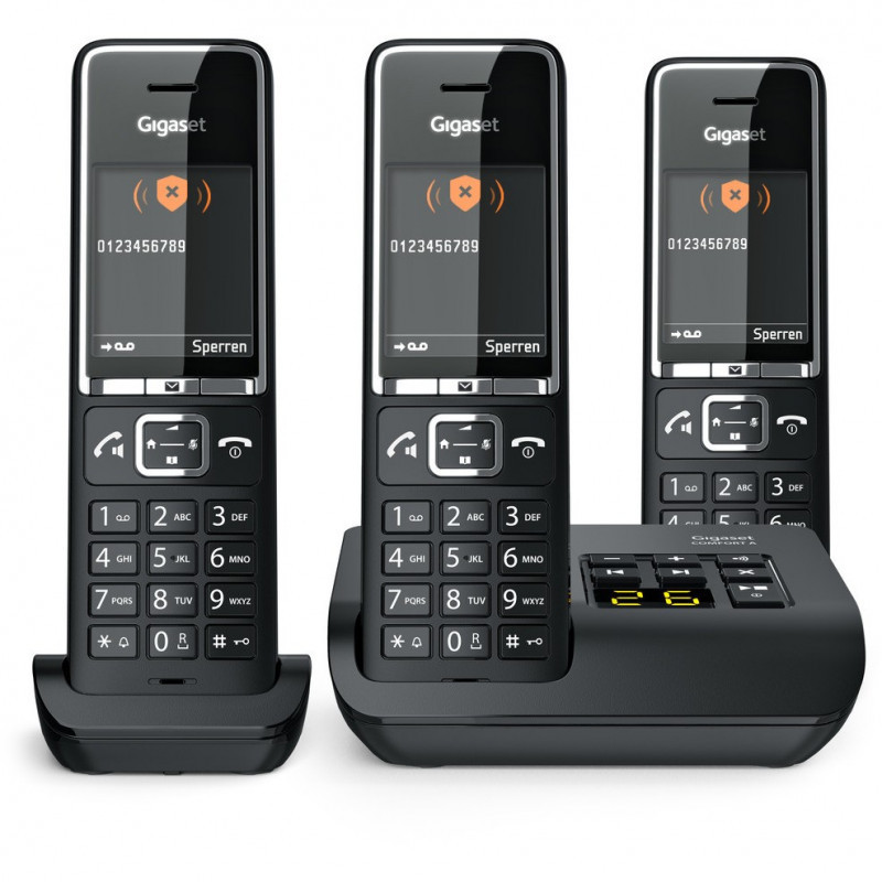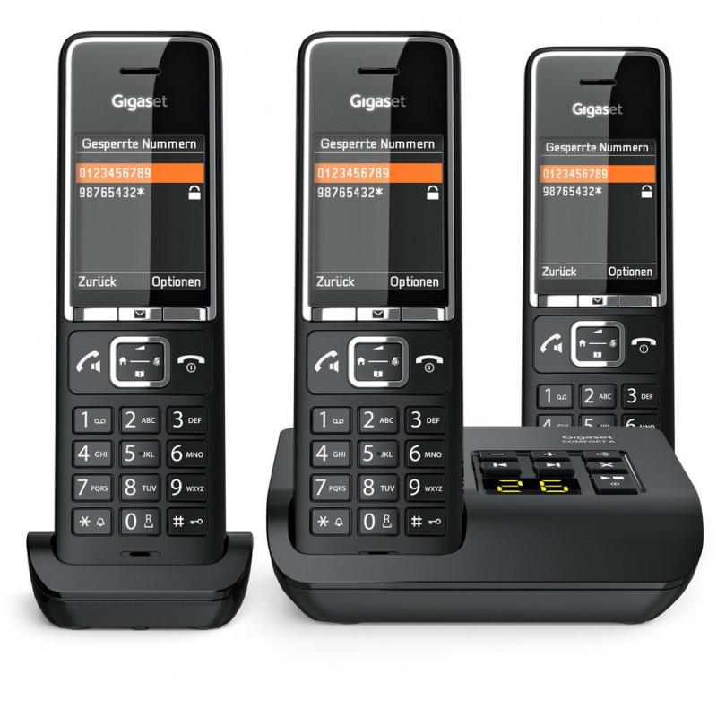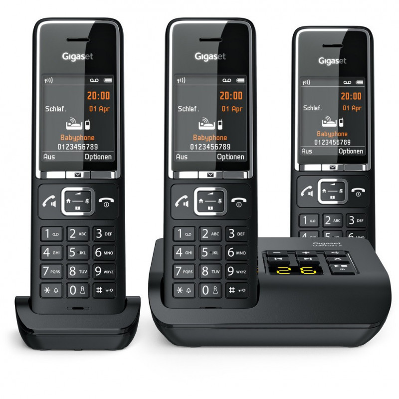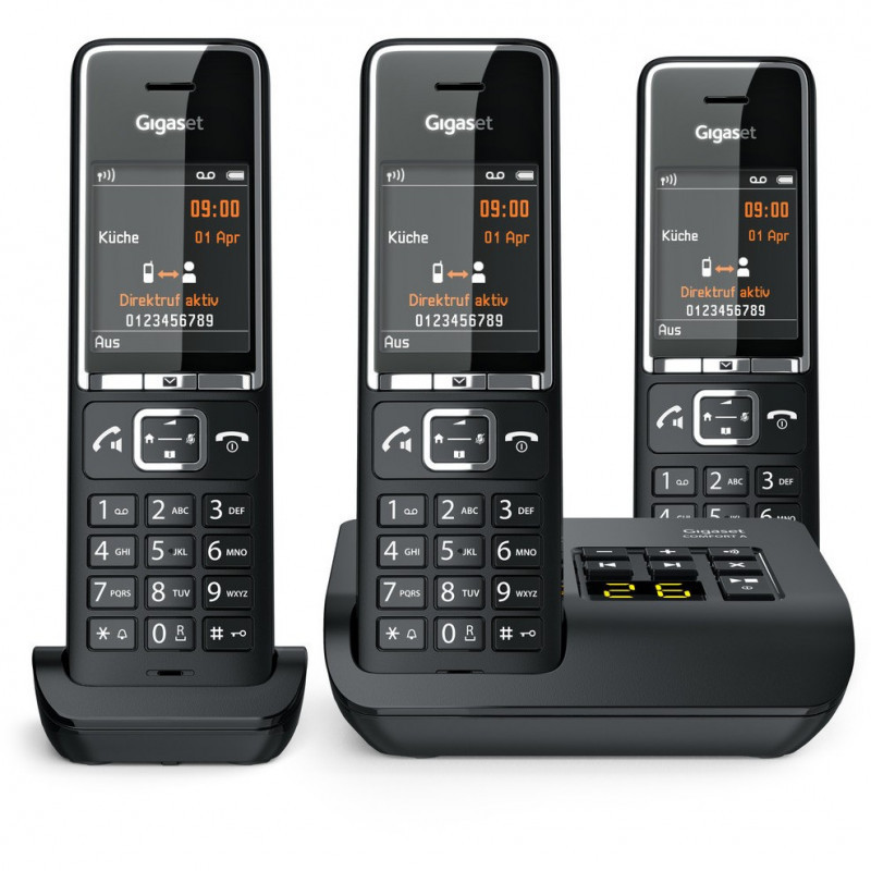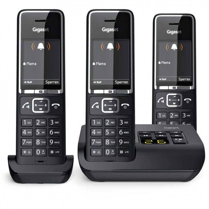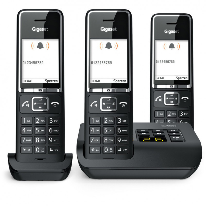 "Gigaset COMFORT 550A. Type: Analog telephone, Handset type: Wireless handset. Speakerphone, Phonebook capacity: 200 entries. Caller ID. Display diagonal: 5.59 cm (2.2""). Short Message Service (SMS). Product colour: Black. Number of handsets included: 3"\n