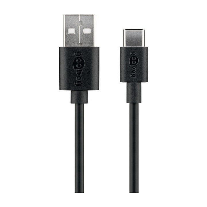 "Goobay 45735. Cable length: 1 m. Connector 1: USB A, Connector 2: USB C, USB version: USB 2.0, Maximum data transfer rate: 0.48 Gbit/s, Connector contacts plating: Nickel/Gold, Product colour: Black"\n"USB connection cables for power supply and data transfer support mobile phones, cameras, headphones, smartwatches, tablets and much more. The Goobay USB cable provides an interference-free connection and creates high-speed transfer rates. Documents as well as audio and video files can be transferred very quickly.