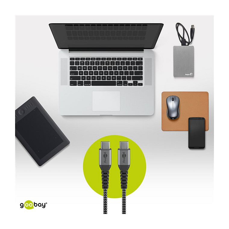 "Goobay 49303. Cable length: 2 m. Connector 1: USB C, Connector 2: USB C, USB version: USB 2.0, Maximum data transfer rate: 0.48 Gbit/s, Product colour: Grey, Silver"\n"USB connection cables for power supply and data transfer support mobile phones, cameras, headphones, smartwatches, tablets and much more. The Goobay USB cable provides an interference-free connection and creates high-speed transfer rates. Documents as well as audio and video files can be transferred very quickly."