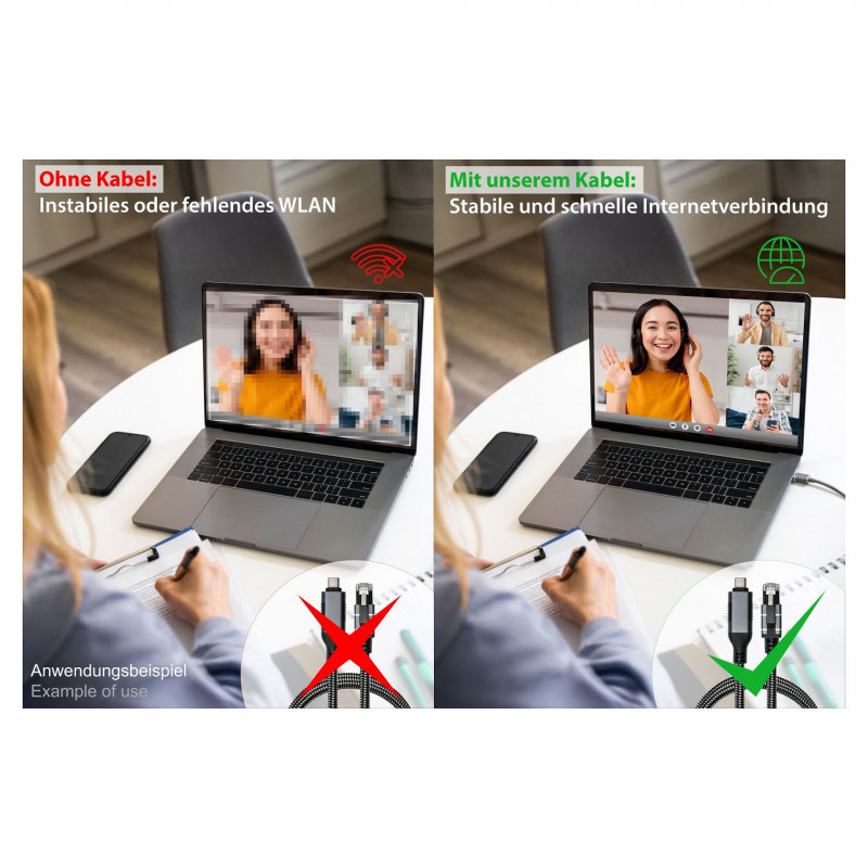"Alcasa Ethernet cable USB-C™ plug to RJ45 plug, textile sheath, anthracite, 2 m, Good Connections®. Cable length: 2 m, Cable shielding: F/UTP (FTP), Connector 1: USB Type-C, Connector 2: RJ-45, Connector contacts plating: Gold, Data transfer rate: 1000 Mbit/s, Product colour: Anthracite"\n"With the high-quality USB-C™ to RJ45 cable from Good Connections®, you can connect USB-C™-enabled devices such as laptops, tablets, or smartphones directly to a wired Ethernet network—without installing any drivers. Ideal for work environments where stability, speed, and reliability are required. Robust design meets performance The cable is covered with a durable textile braid that not only looks stylish but also provides optimal protection against cable breakage and daily wear and tear. The integrated chip ensures fast plug-and-play recognition and stable data transfer. Reliable in any situation - especially when Wi-Fi fails Whether streaming films in high resolution, making video calls without stuttering, cloud gaming, uploading large files or for live transmission of online meetings and presentations - in all these cases, a wired connection ensures maximum stability and a constant data rate. Especially in environments with overloaded or weak Wi-Fi networks, this cable is the reliable alternative for smooth working and media consumption. Intelligent chipset - conventional adapters are a thing of the past The integrated high-performance chipset from Realtek (RTL8153E) enables a stable 1 Gigabit data connection with maximum compatibility. In contrast to older, often error-prone adapter solutions, this cable offers a seamless and reliable connection. This makes the separate use of bulky adapters superfluous. Real Plug & Play function Plug in and get started - without any additional software or drivers. The integrated chipset is automatically recognized by the operating system and establishes a reliable network connection. Ideal for reliable use in the home office, in the office, when streaming or on the move. Wide compatibility The adapter cable is compatible with a wide range of modern devices. Supported devices include MacBook Pro/Air, iPad Pro, Windows notebooks (e.g. from Lenovo, HP or Dell), Chromebooks and Android devices with USB-C™ connection. Works with macOS, Windows, Linux and ChromeOS. Technical data: - USB-C™ to RJ45 adapter cable - Suitable for 1 Gigabit networks, downwards compatible - Connection 1: USB-C™ plug with Realtek RTL8153E chipset - Connection 2: RJ45 plug with latching nose protection - Gold-plated contacts - Shielding: F/UTP - Conductor material and contacts made of copper (CU) - Cable sheath material: PVC + textile braiding - Outer sheath diameter: 6.3 mm +/- 0.1 mm Color: anthracite Length: 2m