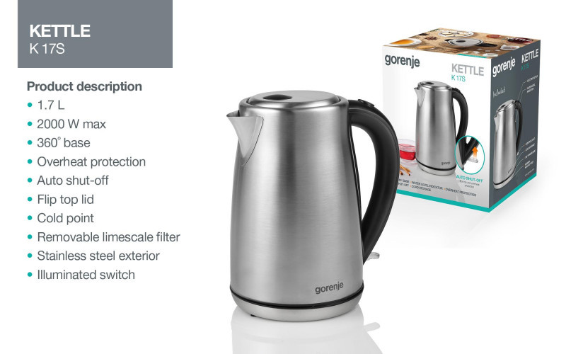 Gorenje | Kettle | K17S | Electric | 2000 W | 1.7 L | Stainless steel | 360° rotational base | Stainless steel