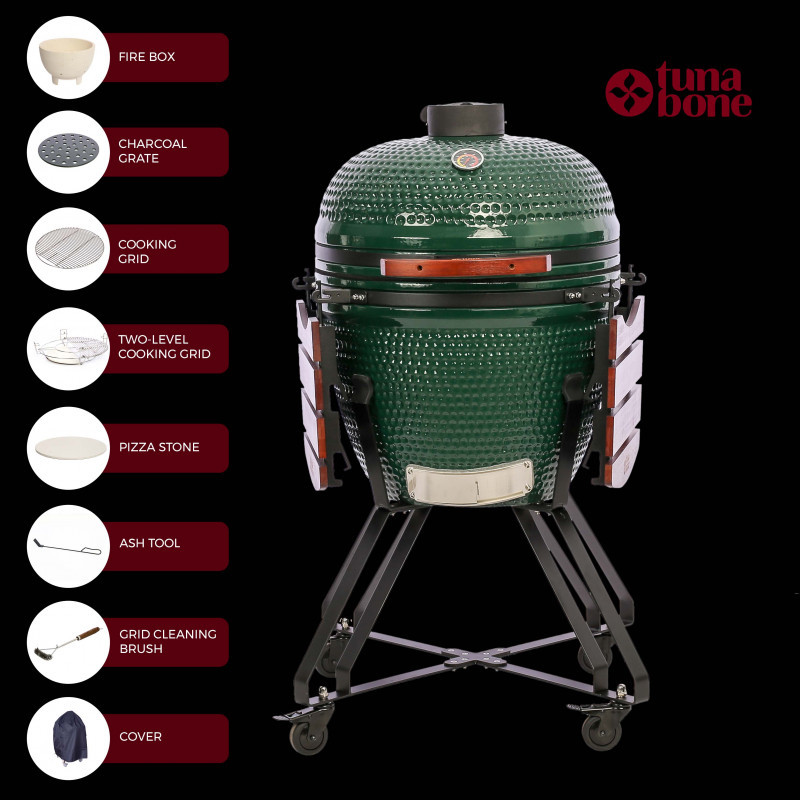 TunaBone Kamado Classic 23" yra aukštos kokybės keraminis grilis, skirtas įvairiems lauko gaminimo būdams. 23 colių (apie 58 cm) kepimo plotas suteikia pakankamai vietos tiek kepsniams, tiek daržovėms ar kitiems patiekalams. Grilis pasižymi tvirtu, ilgaamžiu dizainu, kuris užtikrina tolygų šilumos pasiskirstymą ir efektyvų kepimą. Žalia spalva suteikia šviežią ir modernų akcentą jūsų lauko erdvei.