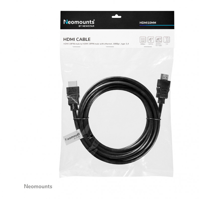 "Neomounts HDMI10MM HDMI cable - 3 metres. Cable length: 3 m, Connector 1: HDMI Type A (Standard), Connector 1 gender: Male, Connector 2: HDMI Type A (Standard), Connector 2 gender: Male, HDMI version: 1.3, Data transfer rate: 10.2 Gbit/s, Product colour: Black"\n"This Neomounts high quality 3 meter HDMI cable, model HDMI10MM, features 2 HDMI male connectors, providing a direct link between HDMI devices such as Blu-Ray players, HDTVs, DVD Players, stereo receivers and more.