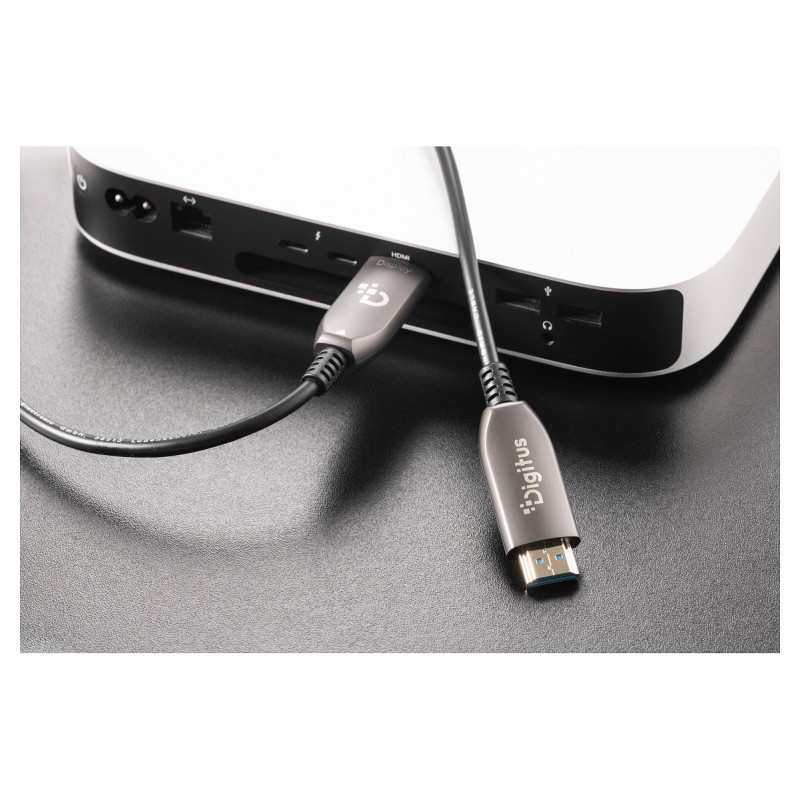"Digitus HDMI AOC hybrid fiber optic cable, UHD 8K, 100 m. Cable length: 100 m, Connector 1: HDMI Type A (Standard), Connector 1 gender: Male, Connector 2: HDMI Type A (Standard), Connector 2 gender: Male, Connector contacts plating: Gold, HDMI version: 2.1, 3D, Maximum resolution: 7680 x 4320 pixels, Data transfer rate: 48 Gbit/s, Product colour: Black"\n"Transmits uncompressed video and audio signals in 8K at 60 Hz (UHD-2) with a bandwidth of up to 48 Gbps losslessly and without latency