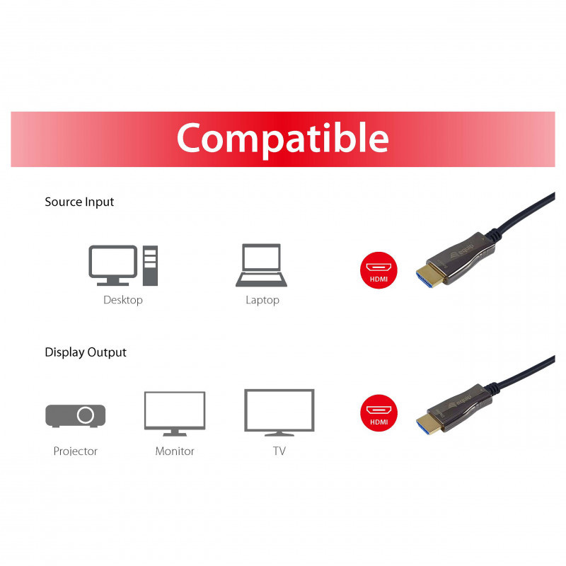 "Equip HDMI 2.0 Active Optical Cable, 10m, 4K/60Hz. Connector 1: HDMI Type A (Standard), Connector 1 gender: Male, Connector 2: HDMI Type A (Standard), Connector 2 gender: Male, Connector contacts plating: Gold, HDMI version: 2.0, 3D, Product colour: Black"\n"The Equip 11943x series Active Optical Cable (AOC) is a cabling technology that accepts the same electrical inputs as a traditional copper cable but uses optical fibre between the connectors to extend HDMI signals with zero loss or latency. Our hybrid cable design consists of optical fibres and copper wires. The high-speed TMDS signals are transmitted through the optical multimode fibres, while the low frequency control signals are transmitted through the copper wires. The range of active optical leads give you up to 100m of distance without a drop of signal quality or the requirement of a separate power supply."