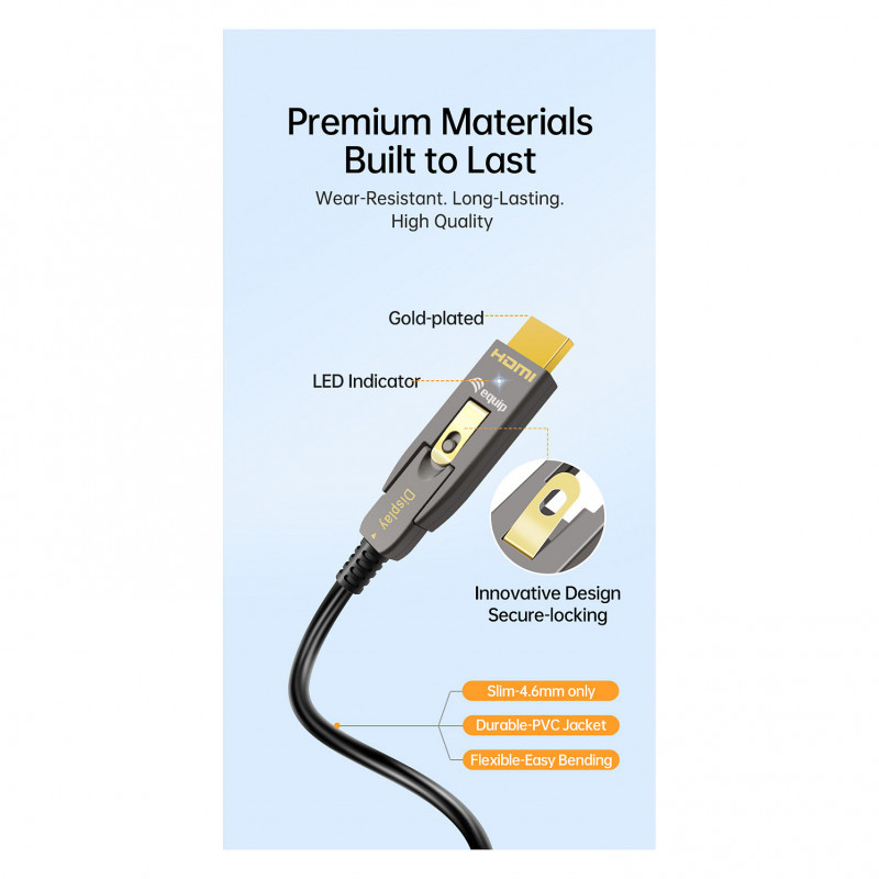 What makes this cable stand out is its detachable connector design, offering both Type D (Micro HDMI) and Type A (Standard HDMI) interfaces in a single solution. This feature ensures broad compatibility with devices such as cameras, laptops, projectors, monitors, and televisions, reducing the need for multiple cables. The compact, lightweight fiber optic construction not only resists electromagnetic interference but also makes installation easier, especially in tight spaces or large venues."