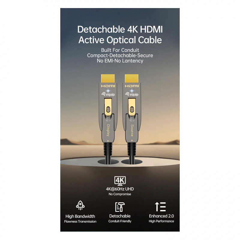 "Equip HDMI 2.1 Detachable Type D + A Active Optical Cable, 15m, 8K/60Hz. Cable length: 15 m, Connector 1: HDMI Type-A/HDMI Type-D, Connector 1 gender: Male, Connector 2: HDMI Type-A/HDMI Type-D, Connector 2 gender: Male, Connector contacts plating: Gold, HDMI version: 2.1, 3D, Data transfer rate: 48 Gbit/s, Audio Return Channel (ARC), Product colour: Black"\n"The Equip HDMI 2.0 Detachable Type D + A Active Optical Cable is designed to deliver superior high-definition connectivity with flexibility and reliability. Built with advanced active optical technology, this cable ensures stable signal transmission over long distances while maintaining uncompromised image and sound quality. Supporting HDMI 2.0 standards, it allows resolutions up to 4K at 60Hz with HDR, delivering sharp visuals, vibrant colors, and smooth motion for gaming, home theater, or professional AV setups.