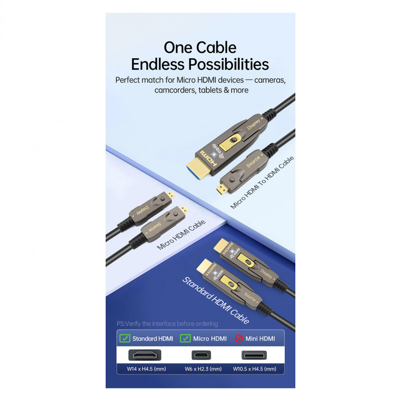 What makes this cable stand out is its detachable connector design, offering both Type D (Micro HDMI) and Type A (Standard HDMI) interfaces in a single solution. This feature ensures broad compatibility with devices such as cameras, laptops, projectors, monitors, and televisions, reducing the need for multiple cables. The compact, lightweight fiber optic construction not only resists electromagnetic interference but also makes installation easier, especially in tight spaces or large venues."