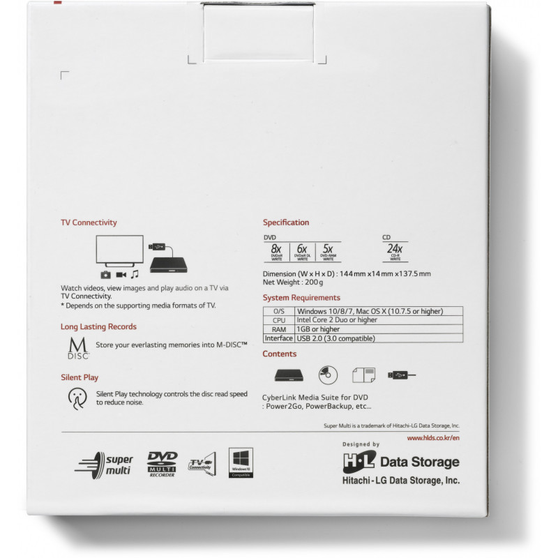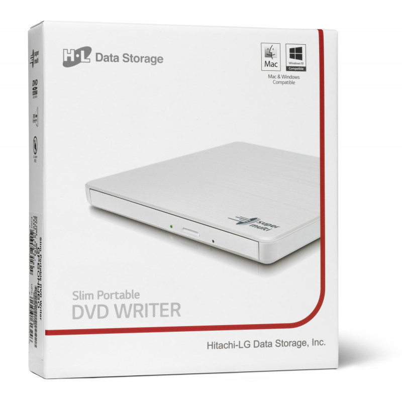 "Hitachi-LG Slim Portable DVD-Writer. Product colour: White, Disc loading type: Tray. Purpose: Desktop/Laptop, Optical drive type: DVD±RW, Interface: USB 2.0. CD write speed: 24x, DVD+R write speed: 8x, DVD-R write speed: 8x. Windows operating systems supported: Windows 10. Width: 141 mm, Depth: 136.5 mm, Height: 14 mm"\n"TV Connectivity