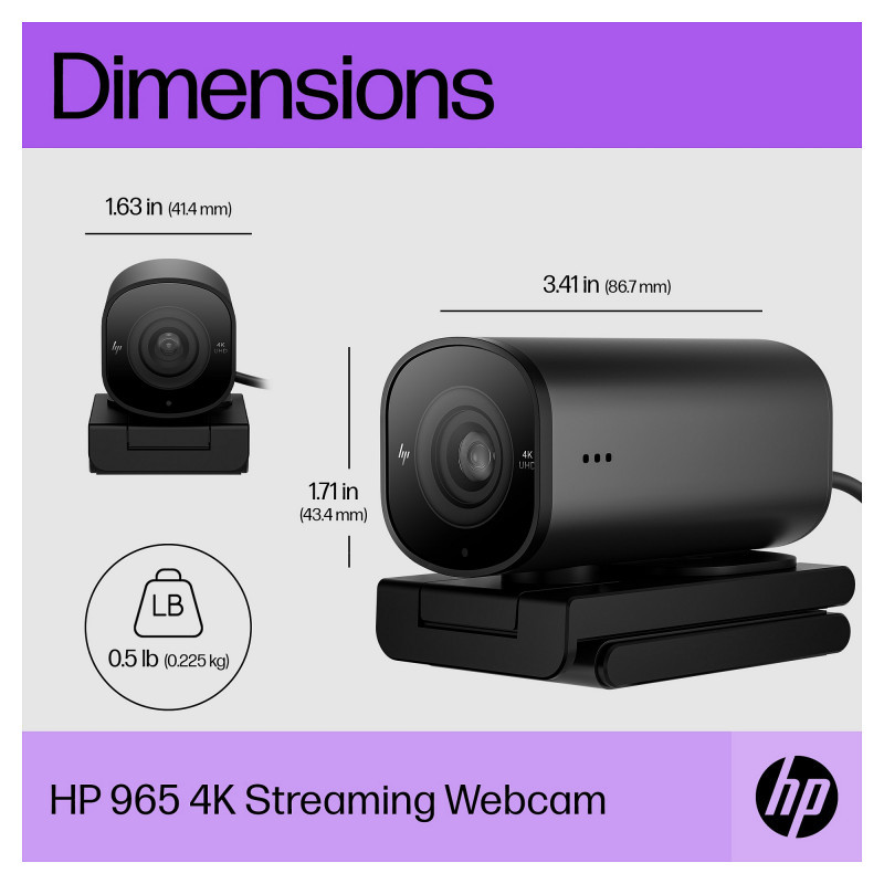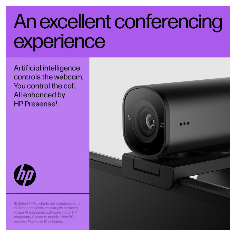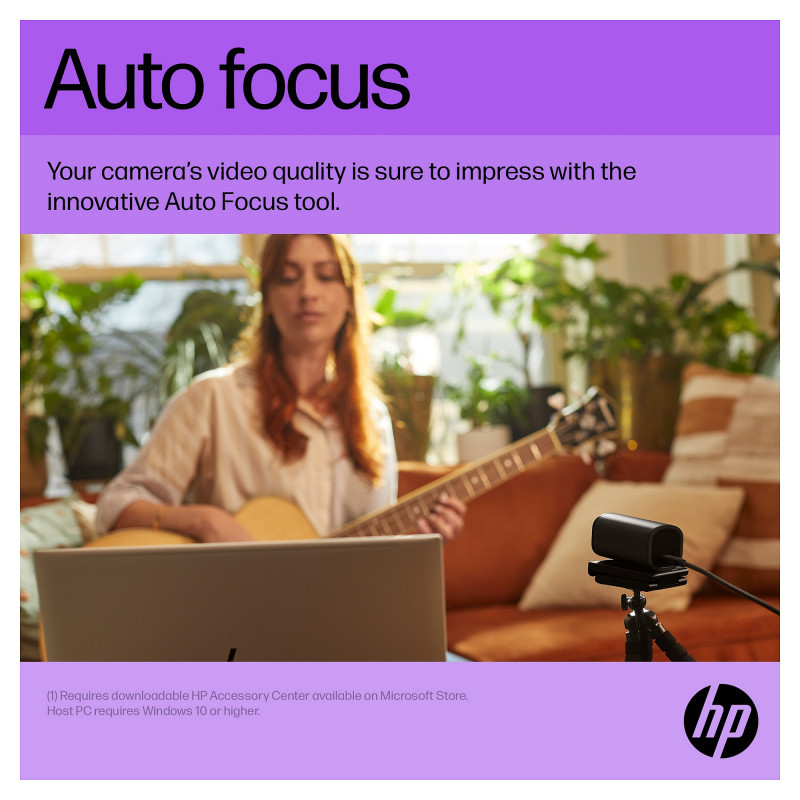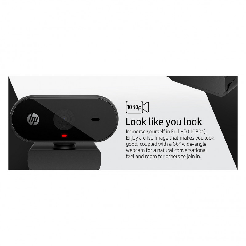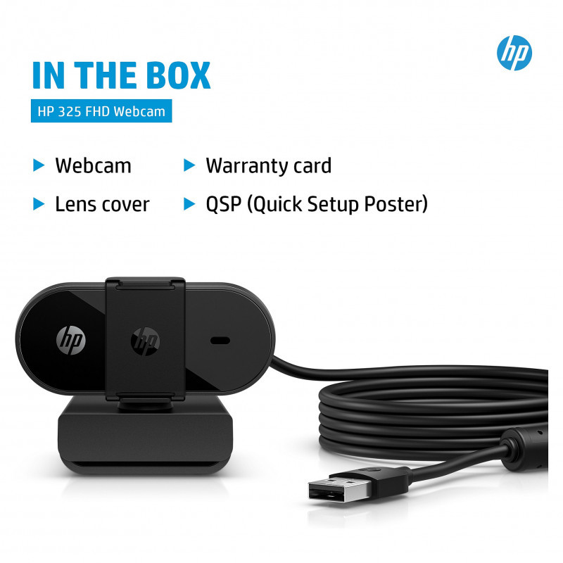 "HP 325 FHD Webcam. Megapixel (approx.): 5 MP, Maximum video resolution: 1920 x 1080 pixels, Camera HD type: Full HD. Interface: USB, Product colour: Black, Mounting type: Clip/Stand. Windows operating systems supported: Windows 10, Windows 11, Mac operating systems supported: MacOS, Other operating systems supported: ChromeOS. Width: 72 mm, Depth: 53.6 mm, Height: 53.2 mm. Package width: 72 mm, Package depth: 53.6 mm, Package height: 53.2 mm"\n"Plug it in and you're on.