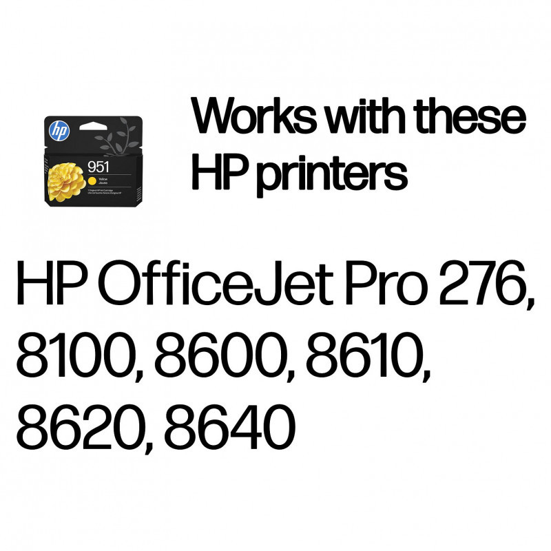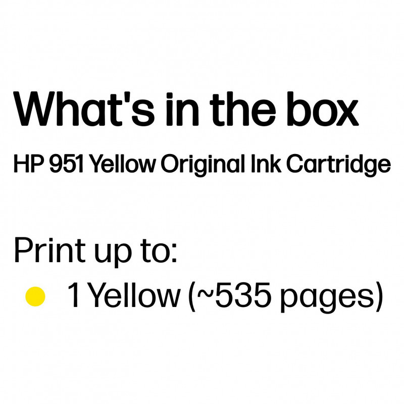 "HP 951 Yellow Original Ink Cartridge. Colour ink type: Pigment-based ink, Cartridge capacity: Standard Yield, Supply type: Single pack, Colour ink page yield: 535 pages, Colour ink volume: 8 ml, Printing colours: Yellow, Quantity per pack: 1 pc(s)"\n"Ideal for small businesses to print professional-looking colour and black text that will stay sharp and resist fading – at a low cost.[1,2]