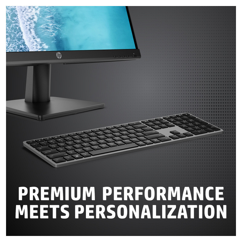 "HP 975 Dual-Mode Wireless Keyboard. Keyboard form factor: Full-size (100%), Connectivity technology: Wireless, Device interface: RF Wireless + Bluetooth. Product colour: Black"\n"Premium Performance Meets Personalization