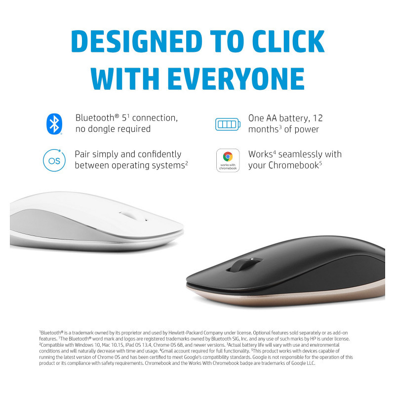 Behold this sleek and stylish mouse with strong Bluetooth® 5[1,2] connectivity, easy navigation with multiple operating systems[3] and a battery that lasts 12 months[4]. With power like that, you can make a statement with every click. All day, every day."