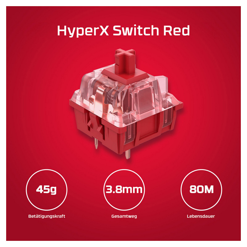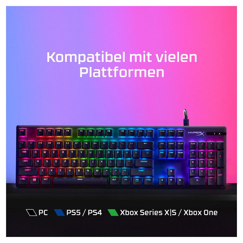 "HyperX Alloy Origins PBT HX Red - Mechanical Gaming Keyboard. Keyboard form factor: Full-size (100%). Keyboard style: Straight. Connectivity technology: Wired, Device interface: USB, Keyboard key switch: Mechanical. Backlight type: RGB LED. Cable length: 1.8 m. Recommended usage: Gaming. Product colour: Black"\n"Durable PBT Keycaps on a Compact Design