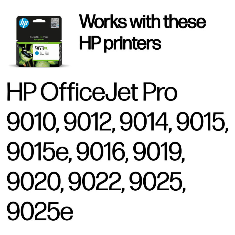 "HP 963XL High Yield Cyan Original Ink Cartridge. Colour ink type: Pigment-based ink, Cartridge capacity: High (XL) Yield, Supply type: Single pack, Colour ink page yield: 1600 pages, Colour ink volume: 22.77 ml, Printing colours: Cyan, Quantity per pack: 1 pc(s)"\n"Ideal for workgroups who need dependable performance for professional-quality printing, page after page.