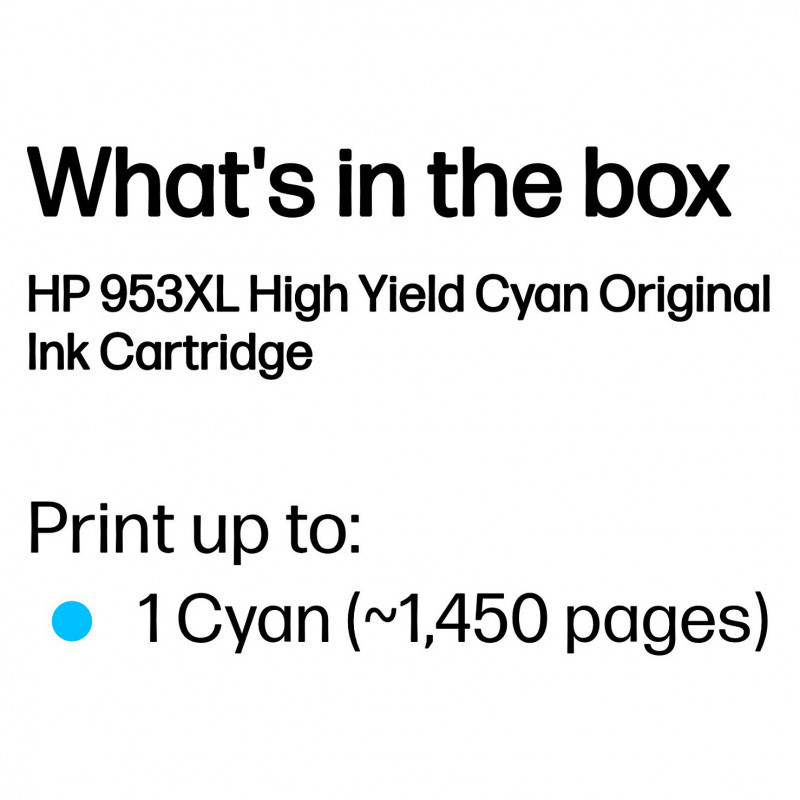 "HP 953XL High Yield Cyan Original Ink Cartridge. Colour ink page yield: 1450 pages, Printing colours: Cyan, Quantity per pack: 1 pc(s)"\n"Ideal for large workgroups who need dependable performance for affordable, professional-quality printing, page after page.