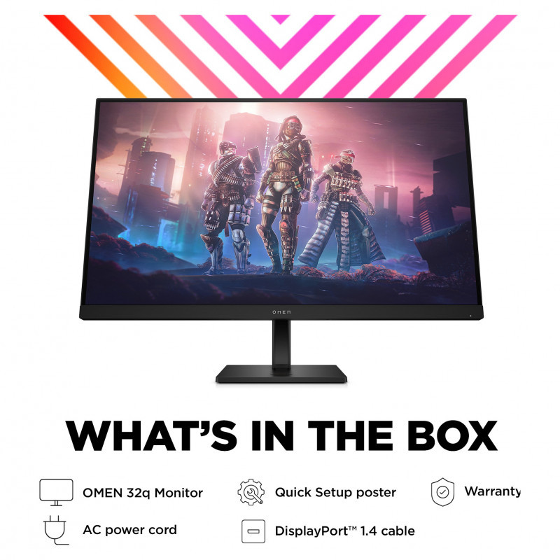 "OMEN by HP OMEN by 31.5 inch QHD 165Hz Gaming Monitor - OMEN 32q. Display diagonal: 80 cm (31.5""), Display resolution: 2560 x 1440 pixels, HD type: Quad HD, Display technology: LCD, Display surface: Matt, Response time: 1 ms, Native aspect ratio: 16:9, Viewing angle, horizontal: 178°, Viewing angle, vertical: 178°. VESA mounting, Height adjustment. Product colour: Black"\n"TAKE YOUR FUN UP A NOTCH