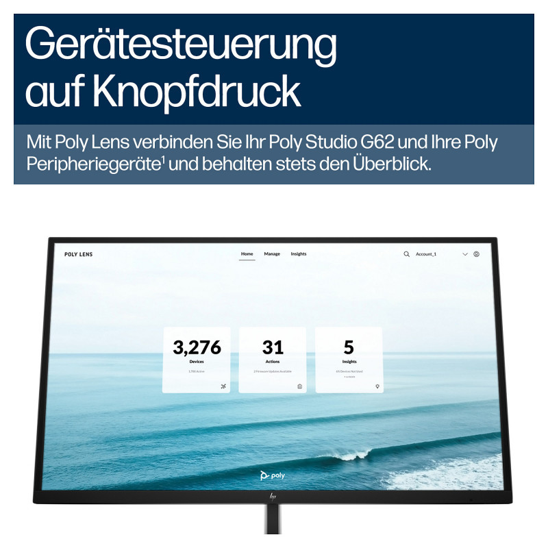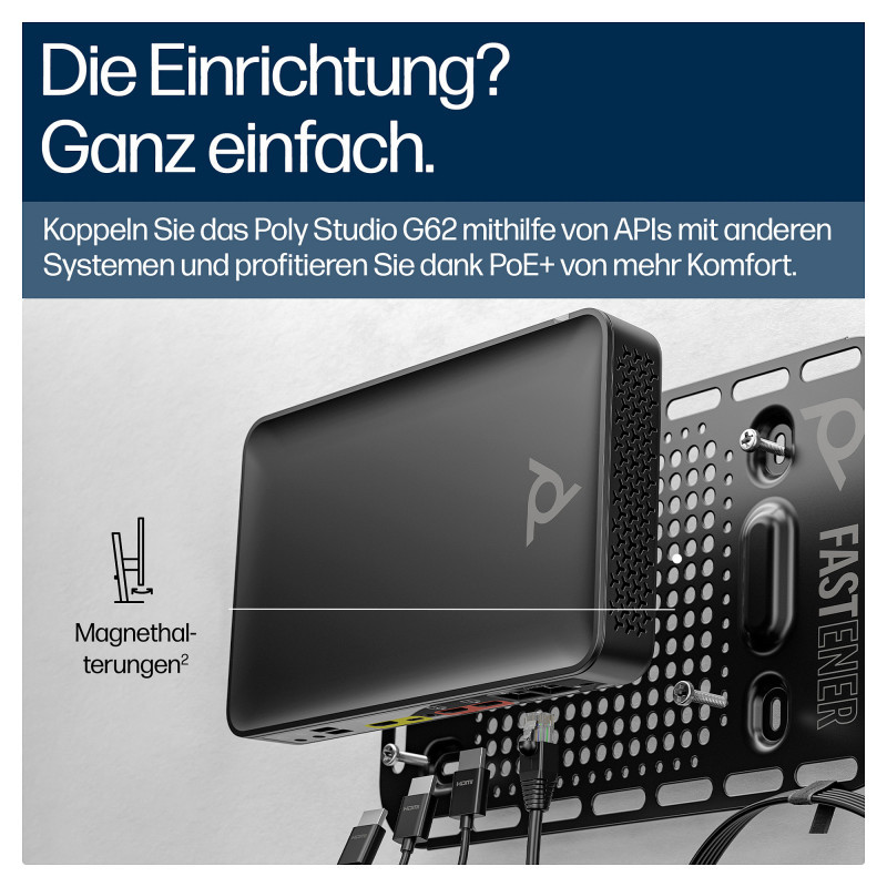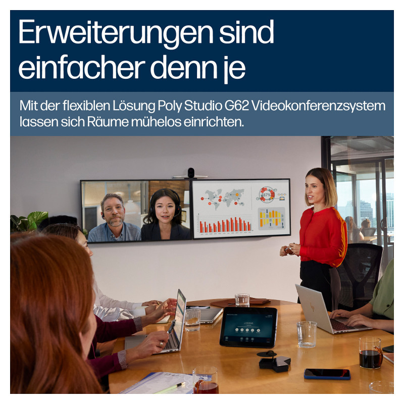 "HP Poly Studio G62 Video Conferencing System With Mounting Plate Kit. Product type: Personal video conferencing system, Number of persons: 10 person(s). HD type: 4K Ultra HD, Maximum frame rate: 30 fps. Ethernet LAN, Wi-Fi. Bluetooth, Product colour: Black"\n"Configurable, powerful, all yours